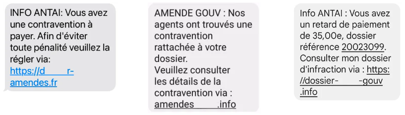 - L’URL du lien à suivre peut également donner des indices. En effet, les sites officiels se terminent tous par gouv.fr (exemple : amendes.gouv.fr). Les sites frauduleux ressemblent quant à eux à « amendes-gouv.org » ou « dossier-antai-gouv.info ».