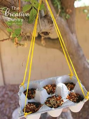 Vous n’avez plus qu’à remplir de graines les emplacements prévus pour les œufs, et à fixer cette mangeoire économique à une branche d’arbre ou à tout autre support placé en hauteur.