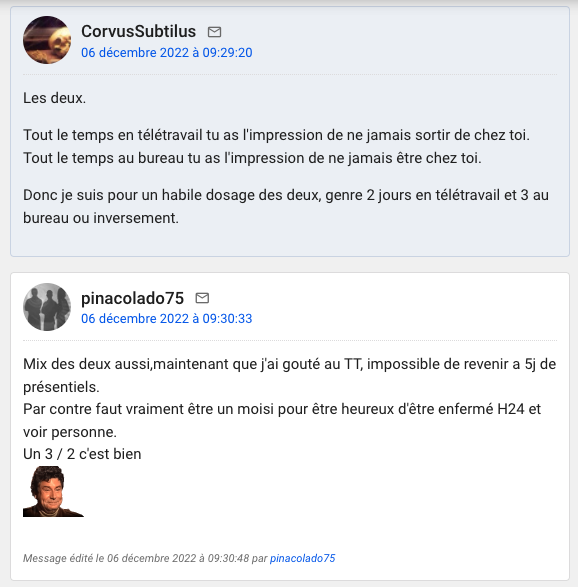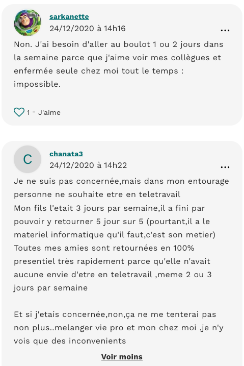 Les deux réponses montrent une préférence pour un travail hybride. Sarkanette a besoin d'aller voir ses collègues au travail et Chanata3 ne veut pas mélanger sa vie professionnelle avec sa vie personnelle.