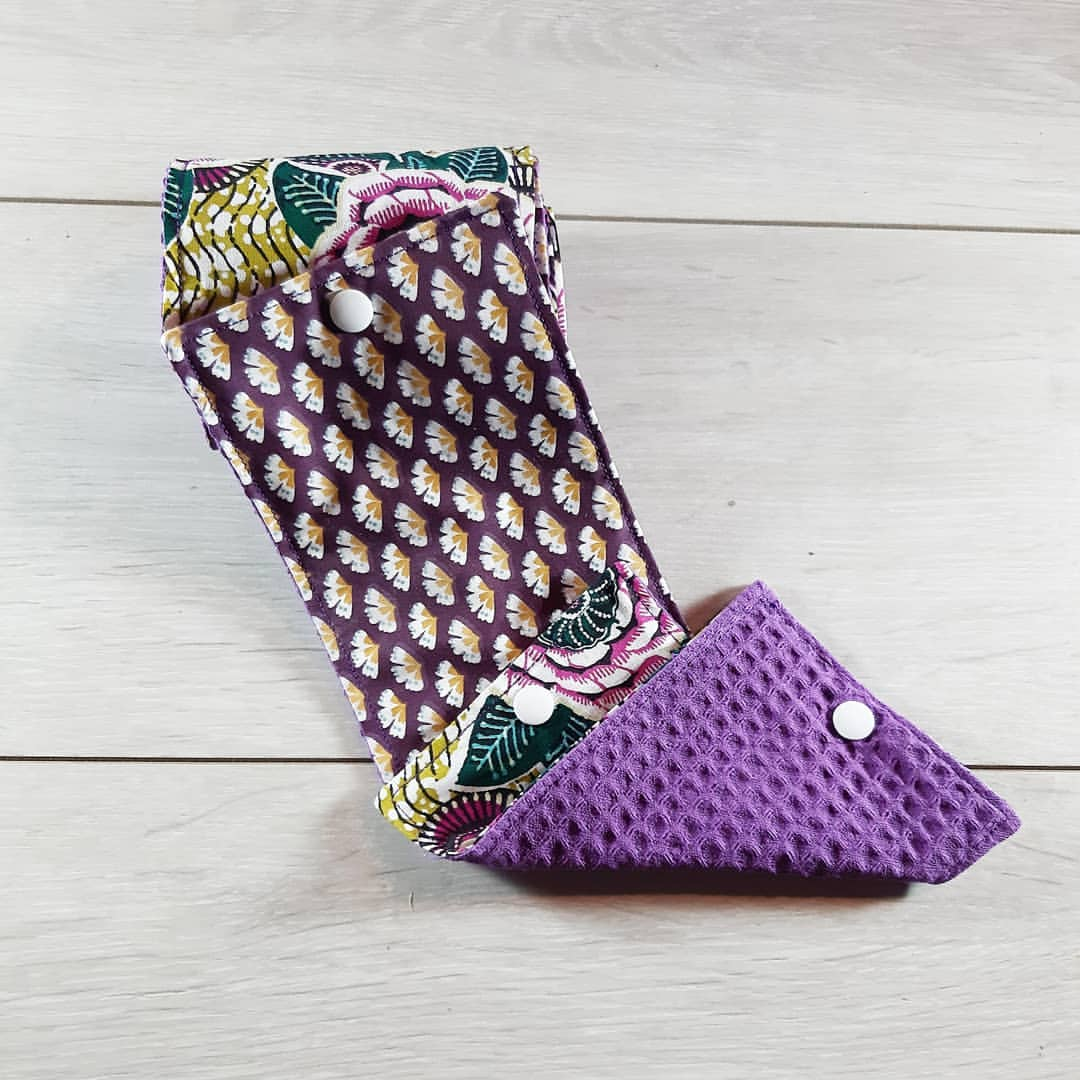 Sur la photo ce papier hygiénique lavable possède un système de boutons pression qui relient les feuilles pour former un rouleau. Retrouvez ce modèle sur le compte instagram @lescouturesdaena.